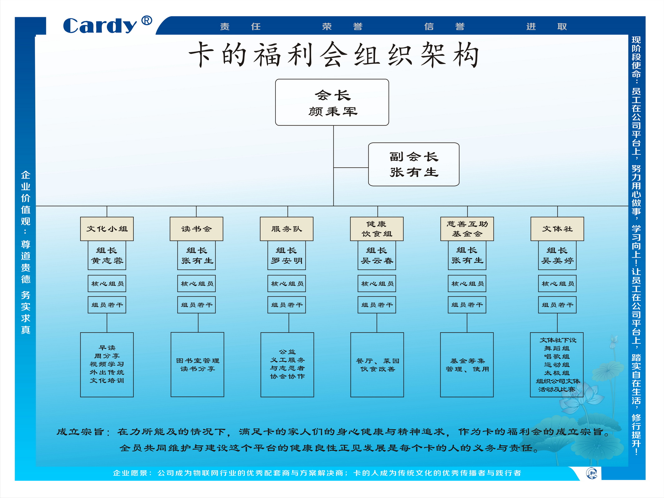 公司以傳統文(wén)化(huà)為(wèi)基礎建設企業(yè)文(wén)化(huà),探索将傳統文(wén)化(huà)與現(xiàn)代企業(yè)管理(lǐ∑)相(xiàng)融合,目前在公司推廣學習(xí)《弟(dì)子(zǐ)規》、《大(dà)學》、《孝經》等優秀的(de)儒家(jiā)文(wén)化(huà)。公司還(hái)成立了(le★)卡的(de)傳統文(wén)化(huà)學習(xí)小(xiǎo)組、卡的(de)員(yuán)工(gōng)讀(dú)書(shū)會(huì)、卡的(de)義工(g≈ōng)服務隊,經過不(bù)斷的(de)探索和(hé)完善, 2017年(nián)9月(yuè)正式成立系統全面的(de)企業(yè≤)文(wén)化(huà)架構“卡的(de)福利會(huì)”,旨在通(tōng)過每一(yī)位卡的(de)人(rén)力所能(néng)及的(de)參與、奉獻、分(fēn)享和(hé)傳遞,讓卡的(de)家(jiā)人(rén)生(shēng)活幸福、精神富足、實現(xiàn)價值。促進和(hé)維護企業(yèΩ)健康良性發展。