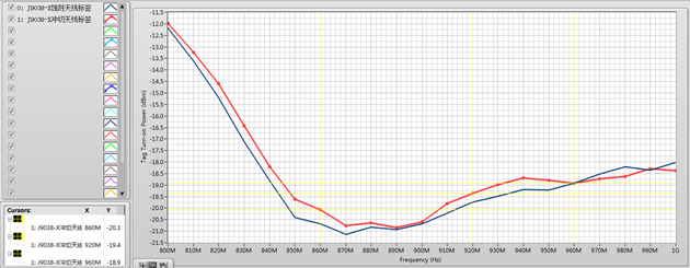 圖2:同一(yī)天線圖形的(de)沖切天線與化(huà)學蝕刻天線标簽頻(pín)譜特性對(duì)比圖