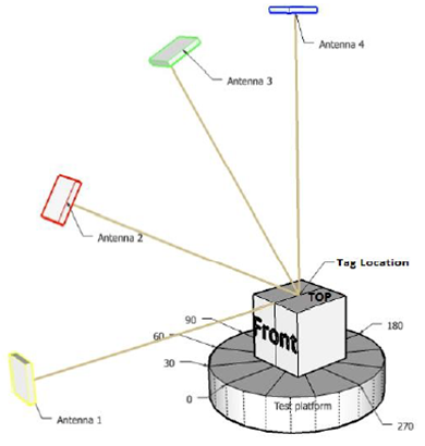 ARC認證采用(yòng)的(de)設備為(wèi)Voyantic的(de)Tagformance儀器(qì),測試環境為(wèi)微(wēi)波暗(àn)室中4個↑(gè)不(bù)同角度的(de)線極化(huà)天線,如(rú)圖6-35所示。這(zhè)四個(gè)天線分(fēn)别叫做(zuò)Ant1、Aγnt2、Ant3和(hé)Ant4,它們與水(shuǐ)平的(de)夾角分(fēn)别為(wèi)0°、30°、60°和(hé)90°。