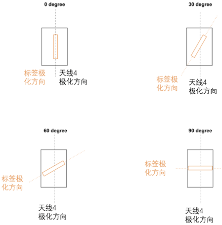 被測标簽放(fàng)置在轉台上(shàng),轉台可(kě)以轉動,在ARC認證中轉台轉動的(de)角度為(wèi)0°、30°、60°、λ120°、150°、180°、210°、240°、300°和(hé)330°。其中90°和(hé)270°時(shí)由于是(shì)标簽極化(huà)方向,與天線的(de)方向'正交,測試意義不(bù)大(dà),如(rú)圖6-36所示為(wèi)轉台不(bù)同角度時(shí)标簽極化(huà)方向與Ant4的(<de)極化(huà)方向示意圖。