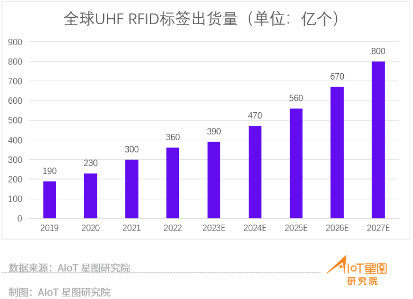 但(dàn)是(shì),RFID無源物(wù)聯網标簽出貨量增速卻呈現(xiàn)越來(lái)越快(kuài)的(de)趨勢,以使用(yòngΩ)量最大(dà)UHF RFID标簽為(wèi)例,根據AIoT星圖研究院最新調研的(de)數(shù)據,雖然在很(hěn↓)多(duō)年(nián)前,UHF電(diàn)子(zǐ)标簽每年(nián)的(de)出貨量就('jiù)超過了(le)100億枚(基數(shù)大(dà)),但(dàn)在最近(jìn)幾年(nián)呈現(xiàn)加速增長(cháng)的(de)趨勢,最近(σjìn)幾年(nián)每年(nián)保持20-30%的(de)增長(cháng)速度。