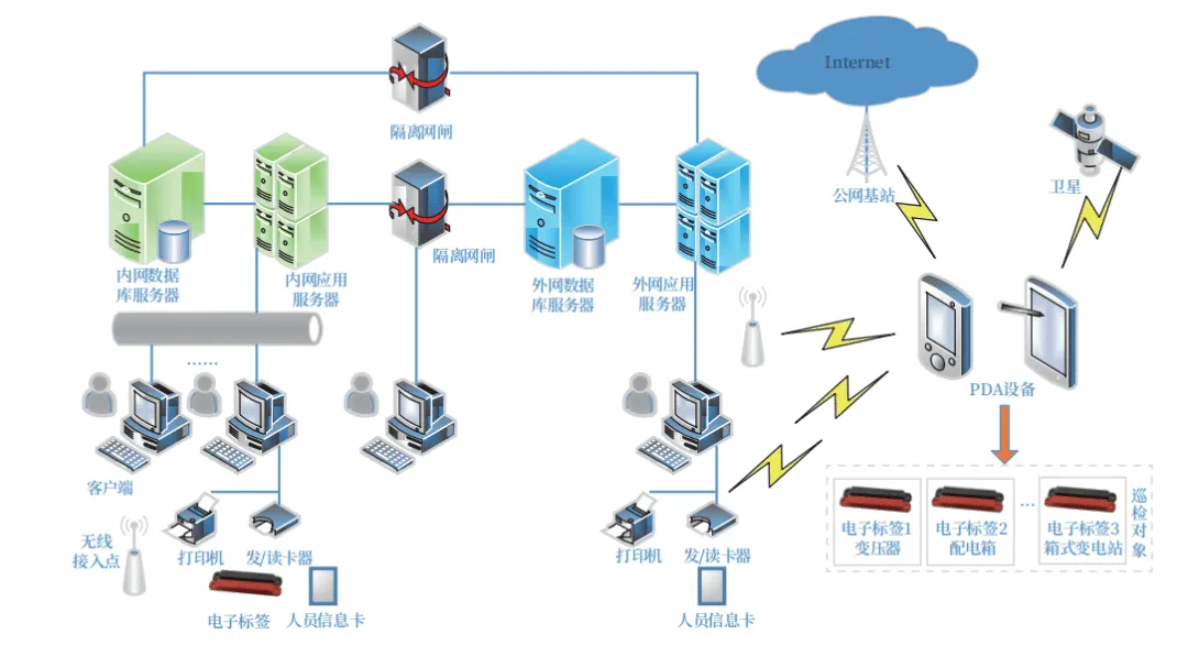 在開(kāi)展正常的(de)設備巡檢工(gōng)作(zuò)之前,應先将電(diàn)力設備按照(zhào)鐵(tiě)路(lù)局內(♥nèi)既有(yǒu)線管理(lǐ)辦法統籌分(fēn)類,各類設備分(fēn)配唯一(yī)标識RFID電(diàn)子(zǐ)标簽,RFID标簽內(nèi)↓寫入設備的(de)履曆和(hé)安裝後運維信息等。由于鐵(tiě)路(lù)電(diàn)力設備布置在鐵(tiě)路(lù)線路(lù)沿線或車(chē)站(zhàn)附近(jìn),設備分∑(fēn)散且沿線無鐵(tiě)路(lù)內(nèi)網接入點,RFID讀(dú)寫器(qì)采集的(de)設備信息需要(yào)先存儲在PDA中,再由移動公網(WiFi/4G/5∑G)與鐵(tiě)路(lù)外(wài)網服務器(qì)進行(xíng)數(shù)據傳輸,通(tōng)過隔離(lí)網閘将安全的(de)數(shù)據傳送回鐵(tiě)路(lù)內(nèi)±網。