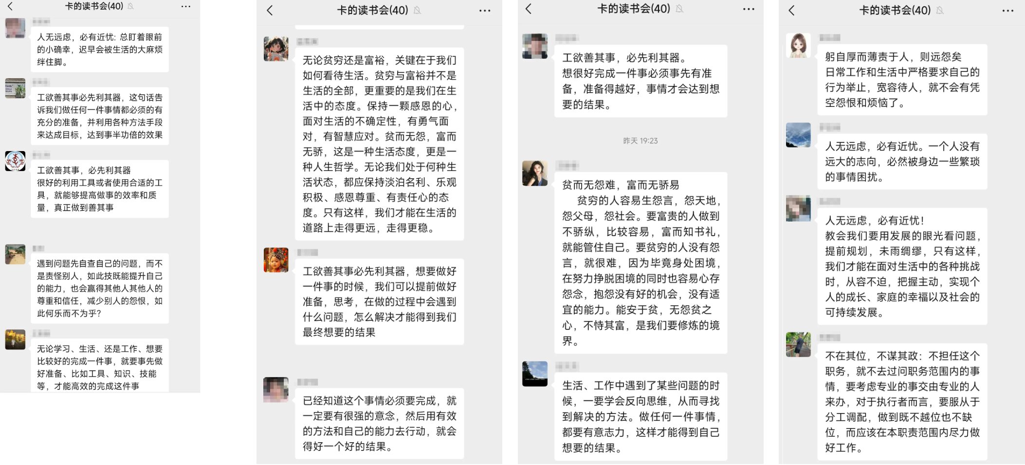 本期讀(dú)書(shū)會(huì)以《論語精選》為(wèi)主線,聚焦《論語》中“不(bù)在其位, 不(bù)謀其政”“古之學者為(wèi)己,今之學者為(wèi)人(rén)”,“人(rén)無遠(yuǎn)慮,必有(yǒu)近(jìn)憂”等經典名句。主講人(rén)顔老(lǎo)師(shī♦)以日(rì)常工(gōng)作(zuò)和(hé)生(shēng)活場(chǎng)景為(wèi)切入點,解讀(dú)古人(rén)智慧對(duì↔)當下(xià)工(gōng)作(zuò)和(hé)生(shēng)活的(de)啓示。